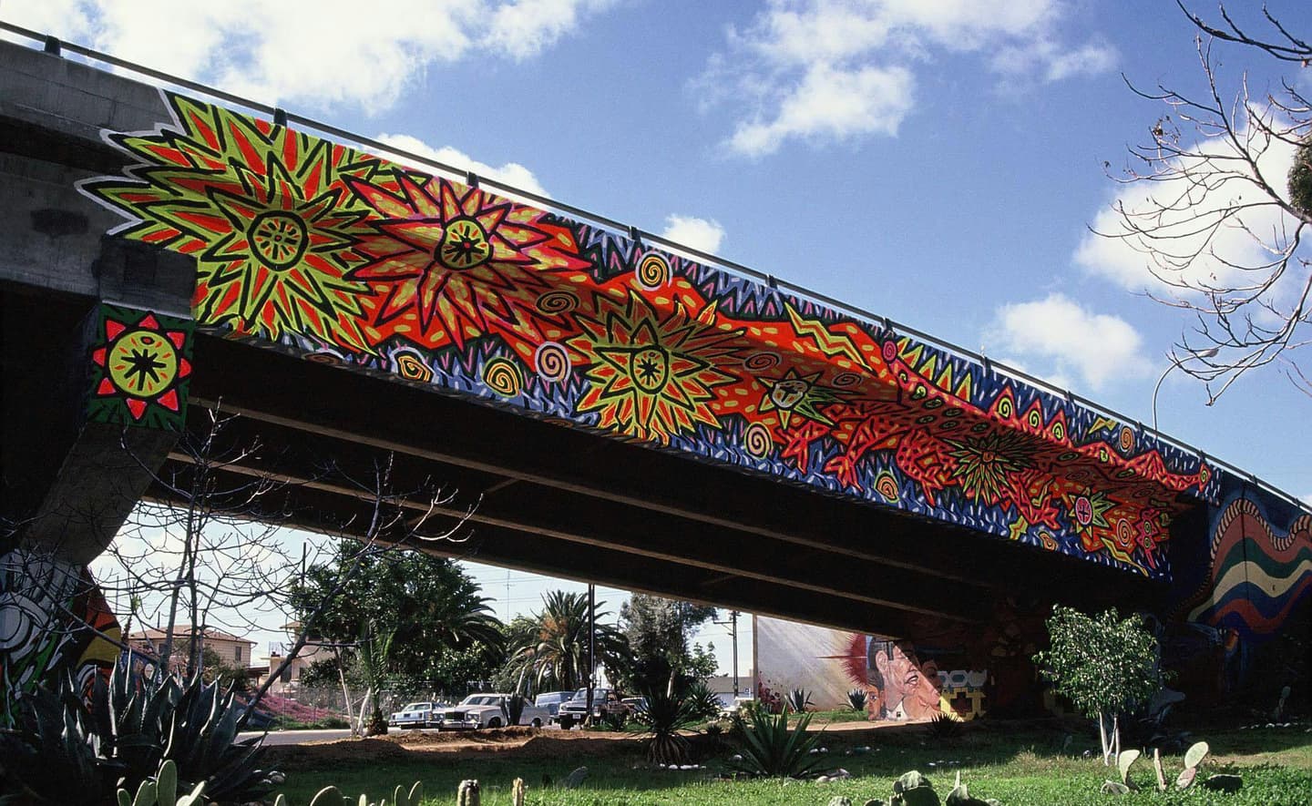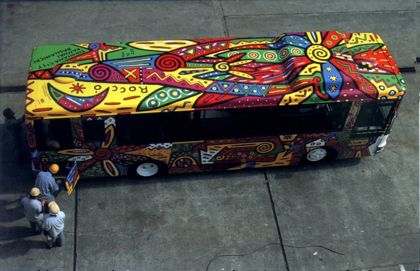 1995年には、横浜市営バスのペイントが話題を呼びました。民間の企業からも数多く壁画などの依頼を受けており、現在も横浜の各地で、その姿をみることができます。(ジャズ喫茶ちぐさの壁画、横浜エアジンのステージなどなど)同年に箱根・彫刻の森美術館に作品を常設。渋谷同潤会アパートのイベント、渋谷区表参道の大壁画を担当。(↗)